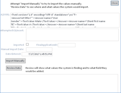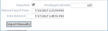 Finally, if you click the “Import Manually” button, the system will attempt to import the XML answer file again. If successful, the imported checkbox is checked, the final application ID is entered, and the manual import date is entered: