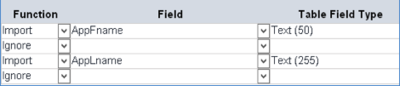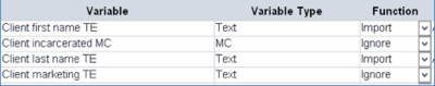 Next is the “function”—that’s what you want done with each variable that comes in from A2J. The options are “Ignore”, the default entry. If set to ignore, the A2J intake can send in data in that variable, but the system will just ignore it, essentially discarding that data. The other option is “Import”. When set to import, the system will look for and operate on data provided in that variable: