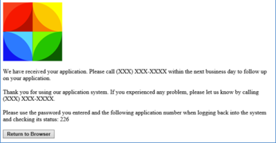 This page shows a successful application (the application answer was saved and imported properly). The first paragraph is the “Successfully accepted application message”, followed by the “Message to be shown every time”, followed by the “Application Number Message.”