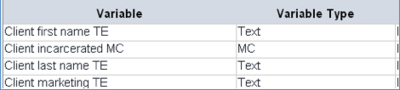 1. Import your A2J Online Intake XML file. Do that by clicking the “Select XML File” button. In the dialog box that pops up, navigate to and select the XML file. For a newer A2J Version 6 interview, that may appear in the “default” folder of the “guides” folder of the A2J website. Once the XML file is selected, proceed to step 2. 2. Click the “Get variables” button to have the system work through the XML to find the variables in the interview. When it does that, it will put the variables it finds into the box in step 3. 3. Review the variables the system has found. If there are variables you have put into the A2J interview that don’t show here, make sure you selected the appropriate XML file and review the A2J interview. They should all be shown here. 4. Press the “Insert Variables” button to add new variables to the system. This is important in new A2J intakes or where you have modified the intake and added new variables. Only the variables that are new are added to the system. Existing ones are skipped, so if they already have settings associated with them, they will remain. 5. Press the “Delete Variables” button to delete variables that were in a previous version of the A2J intake, but do not appear in the newest version. Leaving variables, especially where they were assigned to be imported, can be a source of errors. 6. Press the “Map Variables” button to go to the new variable mapping form. In this form, the variable and its apparent type are shown on the left: