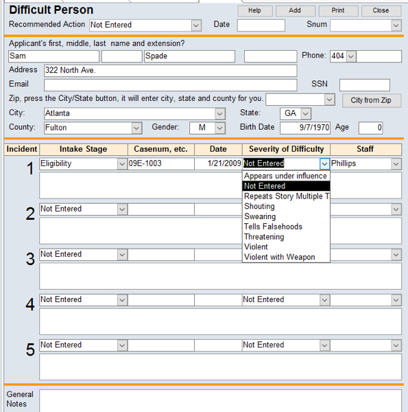 - Add this Client (or Applicant) as a Difficult Person – This will pull up the difficult person’s input form shown below and add the client or applicant’s name and information. You can then document their instance
