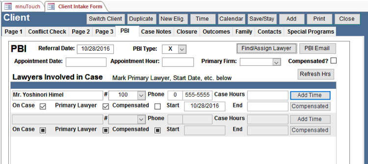 If this is a Volunteer Lawyer/Private Bar Involvement (PBI) case, the PBI tab displays fields to enter information. It allows you to assign an unlimited number of lawyers to a case and keep track of their time, when they started on the case, when they ended, etc.