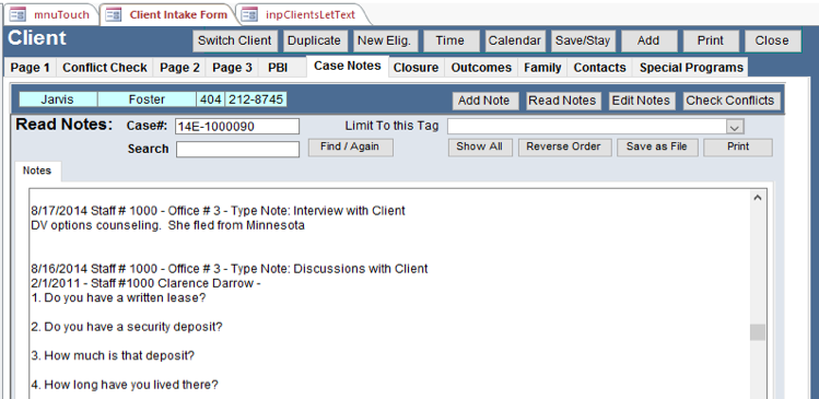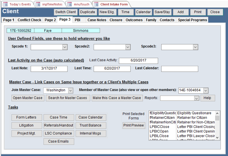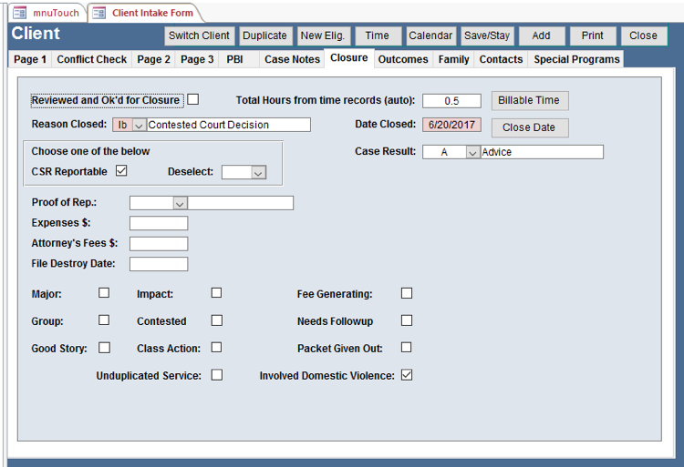 - LSC Compliance - Make sure you comply with LSC regulations by using this part of the client intake to remind staff what requirements there are and to make them check off the compliance of this case.
