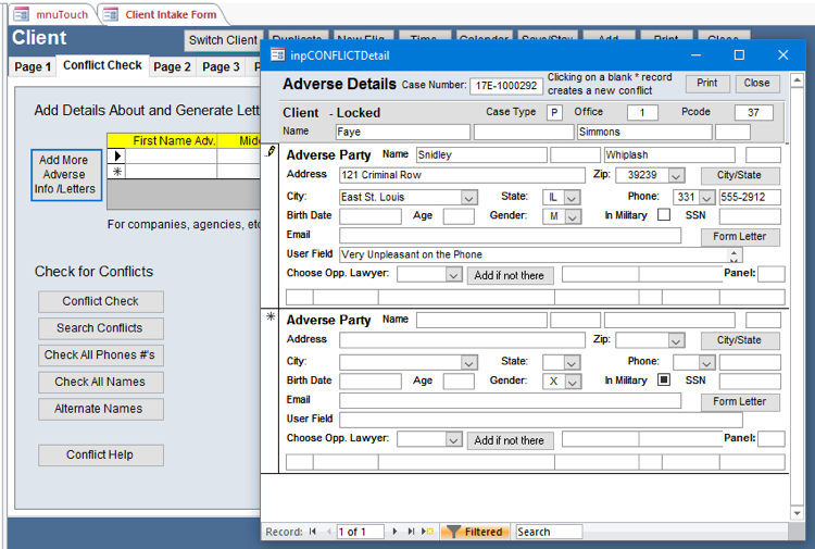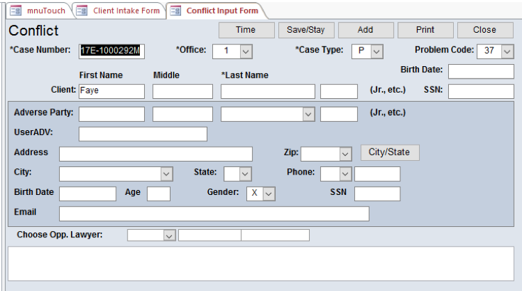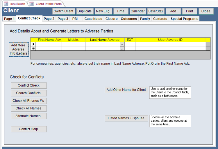 Add Other Name for Client button – Takes you to the Conflict form so that you can add another name for the client to the conflict table, such as their birth name