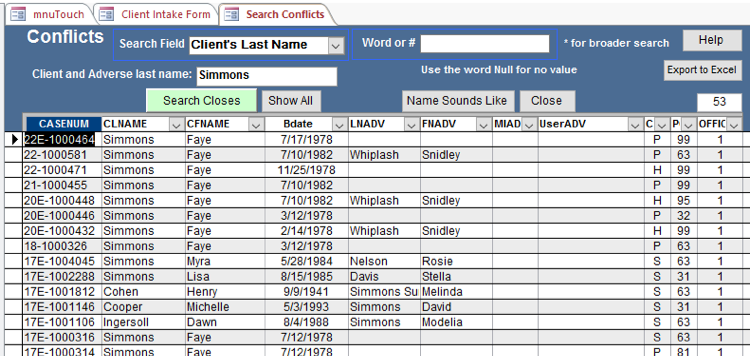 Listed Names + Spouse button – Checks all the parties to the action and puts the results in a search screen so you can review any of the related intakes.