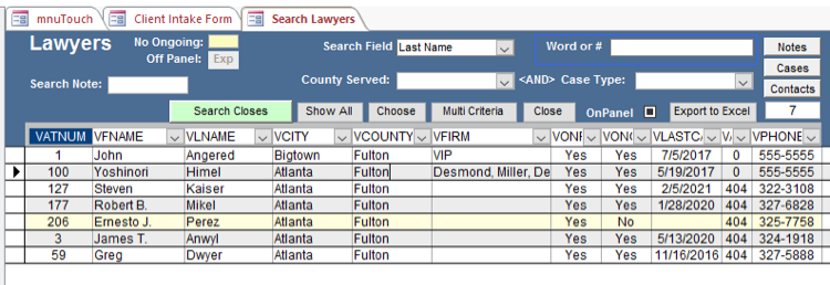 - ii) As you contact the Lawyers to see if they will take the case click on their row, make a record of your call to them using the Contacts button.