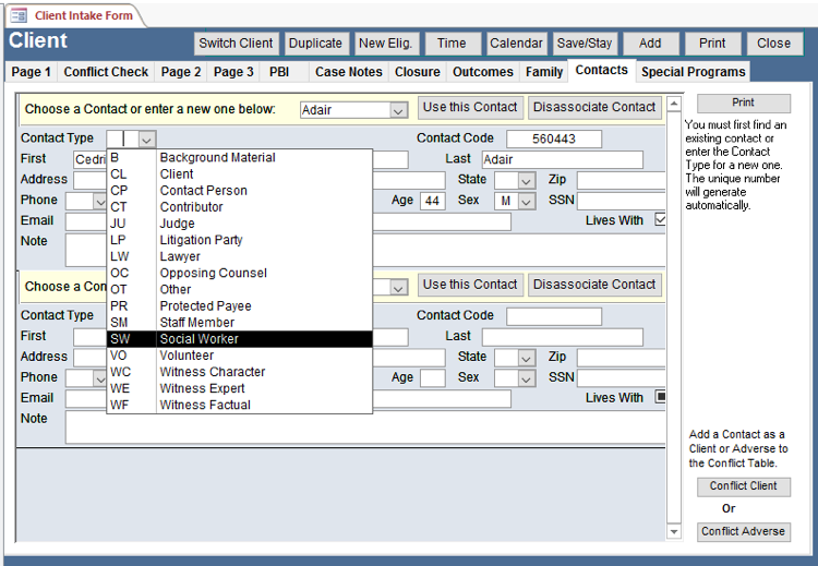 iii) You can add the Contact to the Conflict Table as a client (they came in with the client and are helping) or as an adverse party (they are a social worker who denied the client benefits).