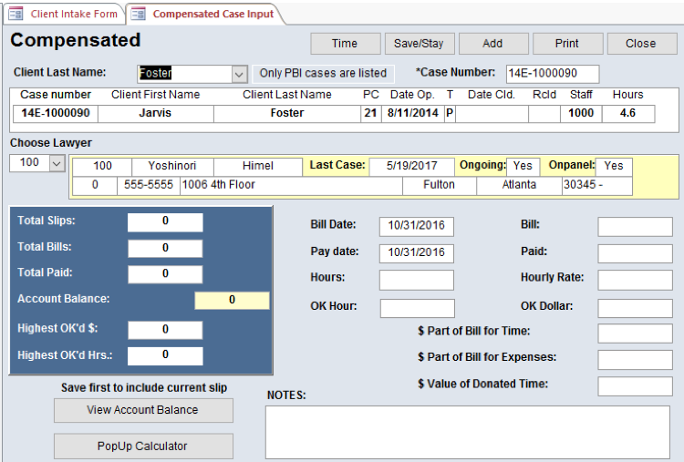 - i) If the case is compensated (Judicare), check the box that says Compensated and click on the Compensated button. This displays the Compensated intake form that tracks bills from the lawyers and your payments.