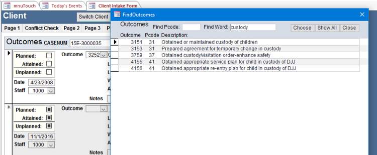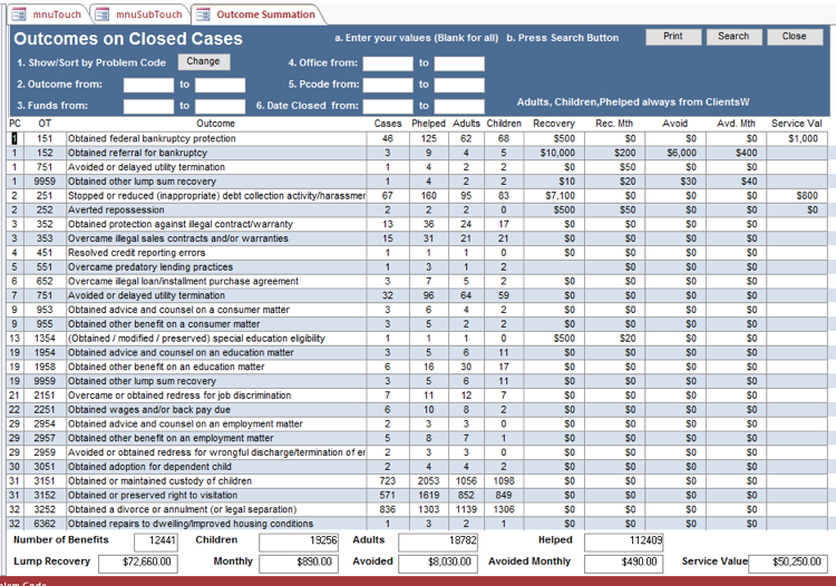 1) LSC requires grantee programs to track Outcomes (formerly called Benefits) for extended service cases. Some state IOLTA programs also require the tracking of these outcomes. A separate Outcomes tab gathers this information. See the Administrator’s Functions section under Setup Tables to see how to add to or modify your list of outcomes.