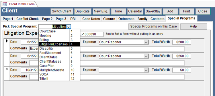 3) Prime comes with some Special Programs (SP) already built in. They are chosen from a pull down. For example, we give you a Litigation Expenses SP.