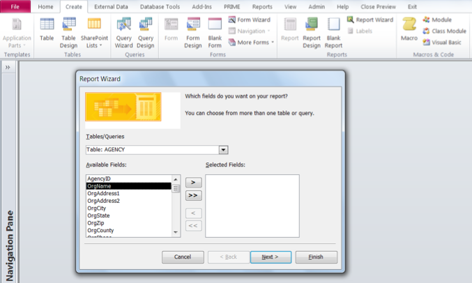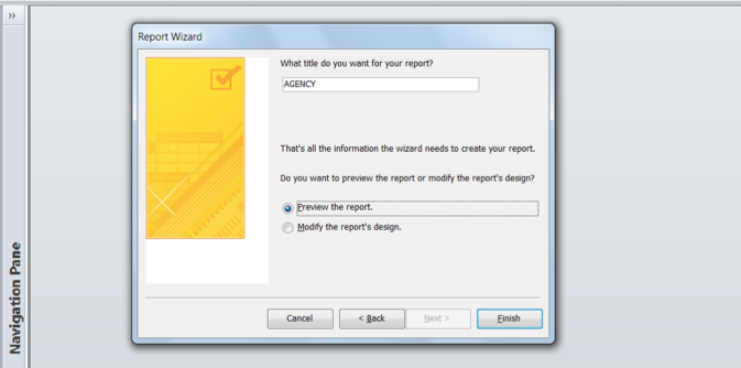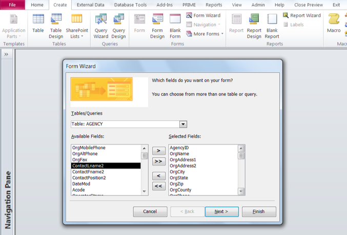 5) Give your form a name and hit Finish to see your created Form. Note: Begin the name with an F. If you want to find it easily, follow this naming convention, F + your offices letters + _ + the name of the form. Example: FKCW_AgenciesByOffice