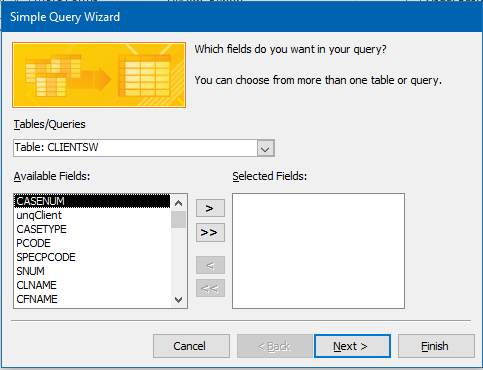 - ii) For our example I chose these fields: Casenum, Clname, Cfname, Pcode, Snum, Dopen, Officenum, Dclosed and Fundsnum.