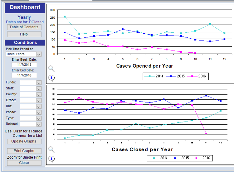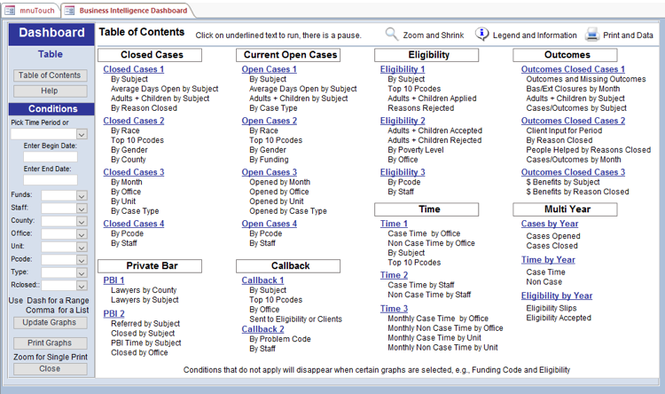 The Business Intelligence Dashboard turns data into information. It gives you a visual picture of what your office does. It lets you compare different services in your program. It’s like numeric reports but gets out information more quickly, gives you more information, and makes the information easier to understand and compare. It allows users to run it on a regular basis to recognize trends and changes, check your intake system, make sure offices are solid, see why you are denying services and insures you are following your priorities.