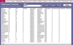 Table and Query Fields – Choosing an object name, such as Agency, brings up a list of the fields in that table with a description of the properties of each field, such as type, size, source, input mask, description, etc.