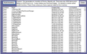 Object Inventory – This generates an object inventory for Prime and saves it in a table call yzstblInventory. It shows the more than 4300 objects in the database. It displays the names of all the forms, reports, queries, etc. It provides both the date on which they were created and the date they were last modified