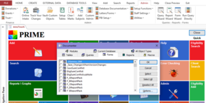 Table Fields – The user who makes many changes in Prime can generate an object inventory of the more than nineteen hundred objects in the database. This displays the names of forms, reports, queries, etc. and shows both the date on which they were created and the date they were last modified.