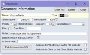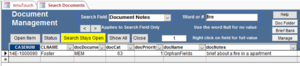 Reading the Search Screen – The above example search screen found all the documents in the system that mentioned the word ‘fire’ in their notes. This is a Memo (MEM) done on the Foster case and the case number is shown. It is brief bank quality, because the docPriority is tagged as 1. It concerns Landlord/Tenant cases since its docCat (category) is 63 (which is the problem code for Landlord/Tenant). The document carries the name OrphanFields and is about a fire in an apartment. The document can be opened from here by clicking Open Item.