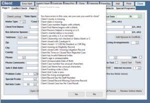 Every office is acquainted with the Error Alert that runs on startup and checks both open and closed cases for errors. These checks use stored procedures on the SQL Server. Some offices have created their own stored procedures that check requirements unique to their office. This error checking has been extended in Prime 16 to the Client Intake sheet. The errors that are checked are the same ones used for clients when Prime starts up. If you’ve created your own set of error checking procedures, these can be included with some minor modifications. The error checking can be activated one of two ways: Error Alert Button – A button is provided that the user can press to get a list of errors for that intake sheet. Automatic Checking Upon Exit – A Preference option turns on a feature that automatically error checks the case just before the user exits it If this feature is turned on (it is set for each user so one person may have it turned on and another turned off), a message box appears before the user leaves the case. Although they can still exit the case, they are put on notice of the errors that exist (See below). This checks any case you modify, even if you didn’t originally open it. Screen Shot Below of a Very Bad case