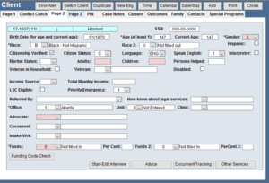 Conditional formatting is a feature in Access that allows the user to set the display properties of a field based upon what the field (or record) contains. This means that the background of fields that you want people to fill out on the intake sheet could be tinted red until there was a proper entry in the field. The field would then change back to the normal white background color. This makes it very easy for users to see if they filled out all the required fields on a page. It would also be possible to use different colors so that a certain color would show on fields required only for a particular type of case, such as This formatting is not limited just to the intake page. Prime 16 has the Volunteer Lawyer Search page tint lawyers who don’t have an ongoing case in light yellow. Those lawyers who are off panel are grayed out. You could change the Client Search screen so that case numbers for seniors would show up in green and those for veterans would be tinted blue. Prime 16 is set up so that required fields have their backgrounds colored a light red until they are correctly filled in. An individual office can easily add this formatting to any additional fields where it is deemed necessary.