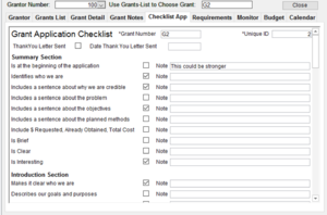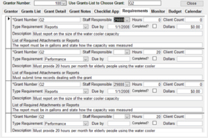6. Requirements – All grants have conditions for receiving the grant. These could be pre-grant (only low income organizations), during the grant period (reporting on people helped) or post grant (what was accomplished with the money). This page allows you to track these requirements and whether they were accomplished
