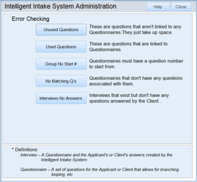 D. Queries The error checking queries can be run off of the Admin Screen for the Intake System and there is a tab on the Question builder that allows you to run them.