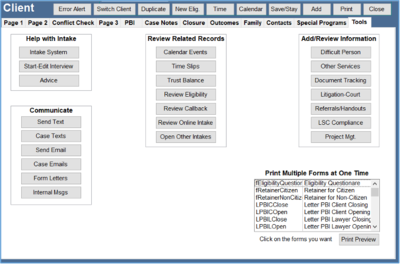 A. The Interview begins by selecting the Intake System button on the Tools tab of either the Client or Eligibility Intake. Earlier versions of Prime have this choice on page 2 of the Client Intake or page 1 of the Eligibility Slip.