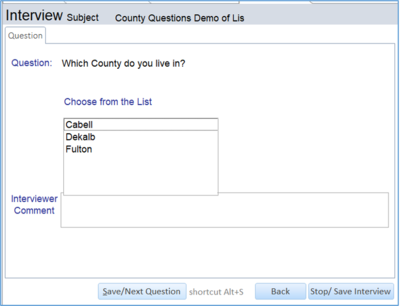 J. Below is a question that presents the user with question that give a List to choose from. The next question the user sees is determined by which of the ‘multiple choices’ they select from the List. For example, Cabell might take them to a list of questions dealing with applying for rental assistance whereas choosing Fulton might go to a different question (since Fulton County might not offer rental assistance).