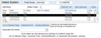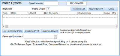 b. FInterviewsOnCase Form that shows up when the Intake System is selected on the Client Intake. Lists old interviews on the case and allows the users a series of options, such as starting a new interview, generating documents, going to an old interview, etc.