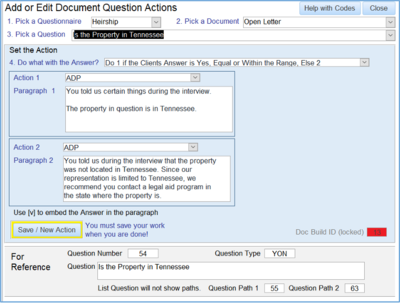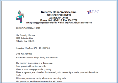 h. Resulting Document Here is a selection from the resulting letter. Remember, what is said here could easily be changed by editing the actions as show above. It will also change dependent upon the client’s answers to the questions. For example, if the property was not in Tennessee, the letter would have only a single paragraph saying: “Since the property isn’t in the state, we can’t help you. Check for legal aid in the other state.”