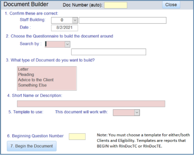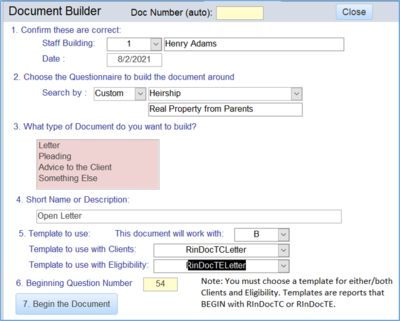 b. RInDocTELetter and RInDocTELetter This is a generic letter template that can be used to create customized letters based upon an interview. It can be used for an opening letter and is provided with example data showing how this is done. It is set up to read the information from InDocBuild table and include information in the letter based upon that table.