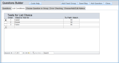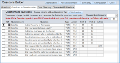 h. Below is the second tab of the Question Builder. It shows the questions already in the system for that Questionnaire. Double clicking a questions allows you to open it up for editing. You CAN also edit the path fields directly on this page. This is very convenient for entering the numbers of the questions that follow the selected one.