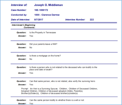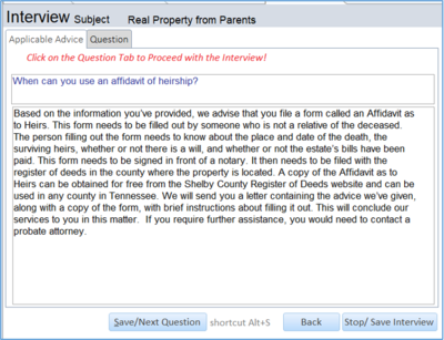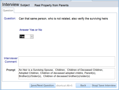 D. We can select a list of questions based on Problem Code, Special Problem Code, National Index Code or a Custom name. Here we select questions from a Custom name called Heirship. Press Start Interview to begin the interview.