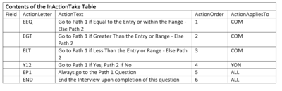 c. InActionTakeList The actions taken during the interview that show what the next step will be if a certain answer is chosen from the list. Unlike the normal question, an answer to a list answer can only have one action. This action is to go to a particular question. Each record in this table holds the possible answer to a question and the number of the next question if that answer is selected. For example, a list of counties might provide the following actions to take based upon the client’s answer: Cabell go to question 5 Fulton go to question 6 Washington go to question 7.