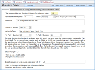 k. InQuestions This contains: i. A Unique number ii. The Questionnaire the question belongs to iii. The question iv. The Type of answer, e.g., Memo v. The Question number of Path 1 vi. The Question number of Path 2 vii. Any values to test the client’s answer against, such as a date or dollar amount viii. Any prompt to display ix. The Action to take based on the answer x. The Advice number to be displayed before the question is.