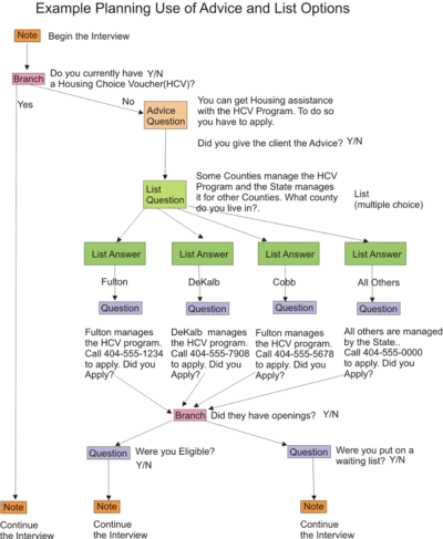 You could also attach a special Advice tab to your question. For example, “Do you owe rent?” If the client answers yes, they could be directed to a question that first displays advice about owing rent and then asks the Interviewer, “Did you provide the advice to the client?”