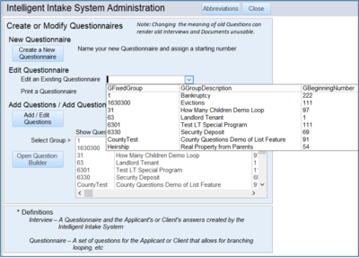 The people using the Intake system fall into two categories. Those who use the Questionnaires to interview applicants or clients, and those who build the interviews. This section deals with building the Questionnaires for intake people to use.