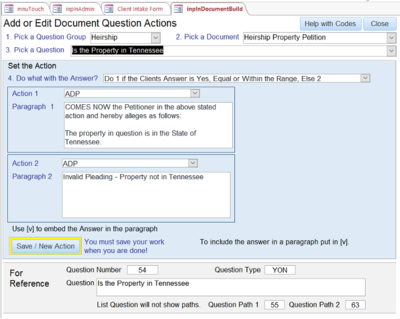 j. inpInDocumentBuild This is the form filled out after filling out the introduction to the document, inpInDocument. It builds the steps to take in the document based on the questions and the client’s answers. There should be a form filled out for each question in the Questionnaire telling the system what to do on the document based on the Clients Answer.