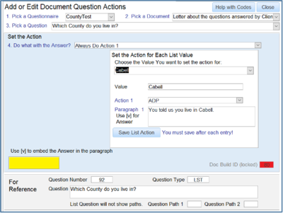 b. You then choose what action you want to take based upon the answer i. If the answer is Yes do 1, else do 2. (There are variations on this where the answer is a date, dollar figure, etc.) ii. Do nothing iii. Always do 1 c. The next step is setting what the Actions are. You can: i. Add a Paragraph ii. Add the client’s answer in a paragraph or by itself d. Putting [v] embeds the client’s answer in the paragraph, for example if the client’s answer was, “I am sick,” a paragraph saying this: The client said, “[v]”. Would result in a paragraph in your document that said this. The client said, “I am sick”. e. You would then click the Save/New Action button to set the action for the next question. f. The ‘For Reference’ section shows the question you are working on and the actions that occur depending on the client’s answer. g. The treatment of Lists (Multiple Choice) Because an answer that uses Lists to choose from is more complicated, setting the action to take is also more complicated. Here we have a list of counties from a different Questionnaire (set of questions). We can set what happens in the letter based upon what selection in the list was made. In the example below, selecting: Cabell Results in a paragraph added that says. “You told us you live in Cabell”