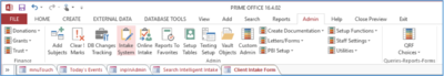 In order to delete and intake it is necessary to first identify the Intake Number. You can do this by using one of the search screens located on Intake System management screen accessed on the ribbon bar under Admin using the button or under the Admin Custom page.