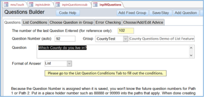 t. srchInQuestions A traditional search screen used to locate a question. This allows the user to see all the questions under a particular group. It also allows you to see where the question links to another question, depending on the answer of the interviewee. Double clicking opens up a form allows the question to be edited and saved. This is called from the InpInAdmin form.