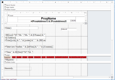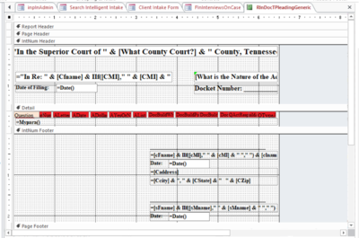 4. This section looks at two templates provided with the system. The first is general letter and the second is a VERY simple pleading. a. The templates have certain things in common. 1. Each is an Access Report. This gives us the ability to loop through the data while also generating a document the content of which is dependent on the client’s answers. It also means that it can be exported to a Word document. 2. Because of the complexity of the code behind the template, it is probably best to modify an existing template to fit your needs rather than to try and start from scratch and build a new one. b. The contents put into the document can come from several sources: 1. The setup of the document as done by the Administrator using the tools provided under the Administrative Menu. This is reviewed above. 2. It can be placed on the document directly, such as by adding fixed paragraphs, labels, graphics, etc. 3. It can get values from the record source of the document. For example, the client’s gender could be used if the document had the ClientsW table in its record source (as either a part of a query or just as a table). 4. The document can prompt you for particular pieces of information. c. The Letter Template 1. This uses the letterhead from your form letters in Prime. Many of the fields are also identical. 2. It addresses the letter based upon the contents of the client’s intake. For example, if sex is ‘M’, it uses Mr. as the client’s title, otherwise it uses Ms. 3. Sincerely is a label. To change it, you can click in the box and put in ‘Yours Truly’ instead.