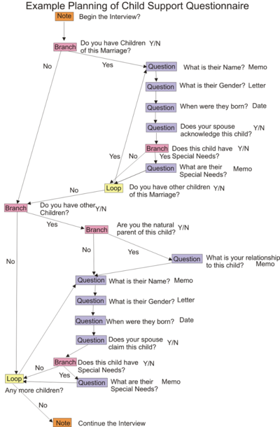 i. Because the questions branch, each interview using the same Questionnaire may end up consisting of different questions. It is also possible that the questions might appear in a different order. The final interview might look quite different for each client, determined by the answers they gave. This is because the order in which questions are seen (or whether they are seen at all) is determined by the answers given by the client.