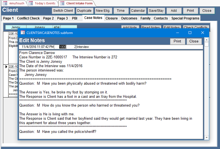 - (b) Add to Case Notes puts the interview into the client’s case notes. This isn’t necessary unless desired, since the interview is stored in the Interview tables. Media:Int14.png