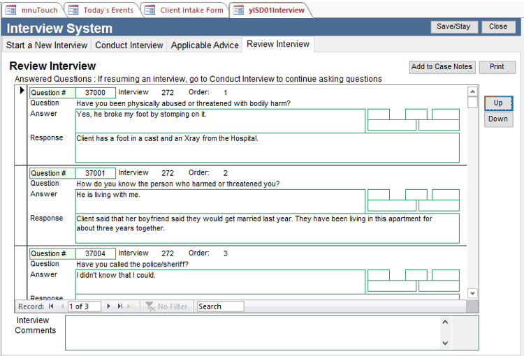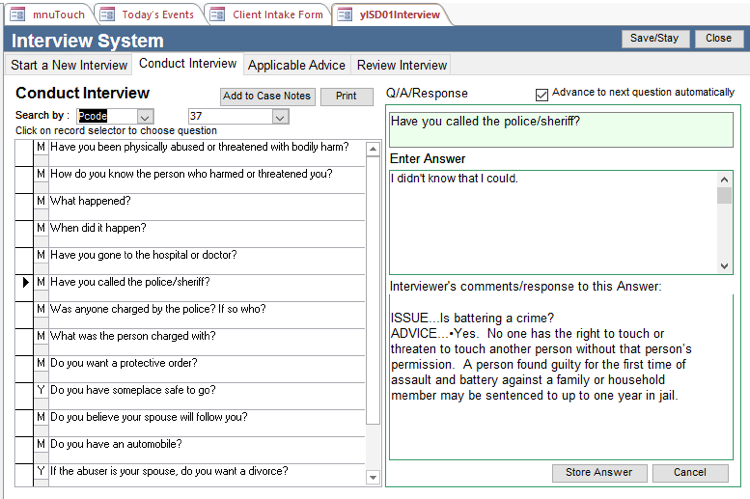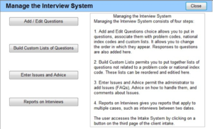 The Interview System makes client intake easier and results in the gathering of essential information during the first contact with the client. The system comes with a set of questions and advice that are linked to words, problem codes, special problem codes, and national index codes but you can add your own. The questions can have Programmed Responses, which depend upon the client’s answers. The Interview System is best understood by looking at its parts: Interviews, Questions, Advice, and Management