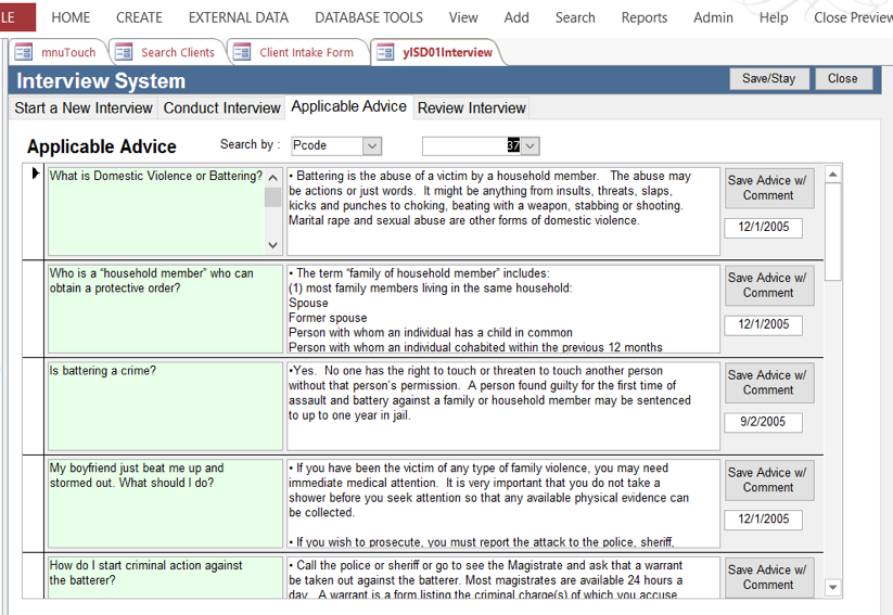 - vii) Sometimes you will reach a point where you want to give specific advice to the client. Here the client didn’t know they could go to the police. We press the Applicable Advice Tab. It displays the advice for that type of problem. You can use the Search by fields on this tab to look for advice and information on any type of problem. Media:Int9.png