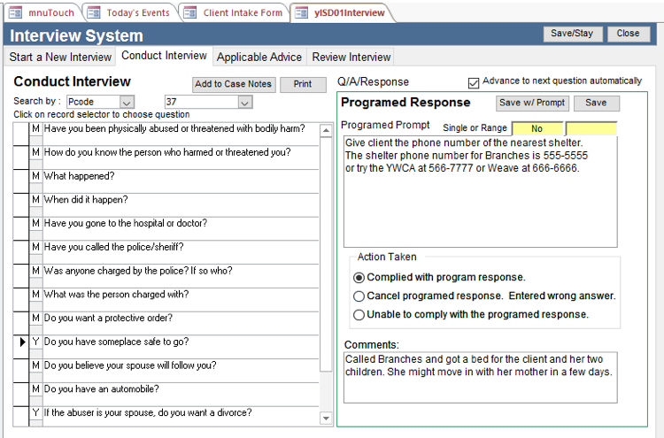 - ix) You can also prompt the client or the intake person about what to do if they get a certain answer to a question. This is known as a Programmed Response. Below, we see the question about a safe place to go. If the client answers No, a programmed prompt appears and gives instructions to the intake person. They then enter if they complied with the instructions.Media:Int11.png