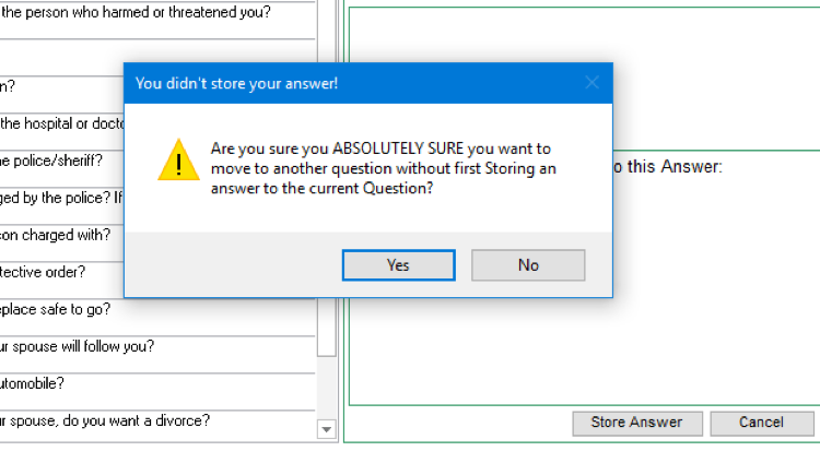 - v) Add Responses to Select Questions - Here is where we can attach programmed responses to questions. These are prompts that come up when a question is answered a certain way. We’ll see this on the Interview later. This programmed response works when the client says they don’t have a safe place to go. The interviewer is prompted to provide a list of shelters and their phone numbers.