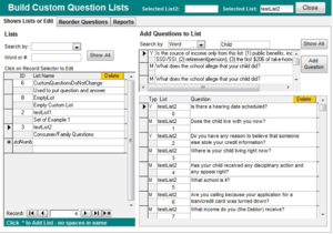 The next thing you might want to do is to build a Custom List of questions. There could be a list for the receptionist, the intake unit, etc. The interface is similar to the one for questions associated with Pcodes, etc. Click on a list and the questions that are part of that list will show up on the right