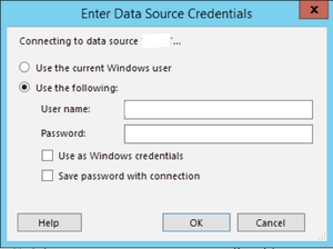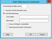 When working with data sets, if you are ever prompted to “Enter Data Source Credentials” as shown here, simply select “Use the current Windows user” and press OK: