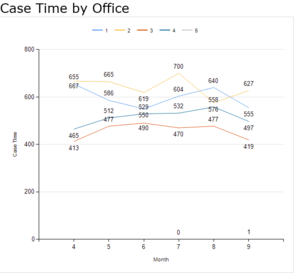 Shows the total time entered over the last 6 months by office. Sudden dips or surges change indicate changes in staffing or the caseloads assigned.
